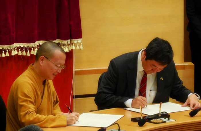 沈祖堯教授、許曉暉副局長分別在典禮上致辭,隨後,廣東六祖寺方丈大願大和尚與香港中文大學校長沈祖堯教授分別代表廣東六祖寺佛學研究理事會和香港中文大學簽署了合作協定,由此,廣東六祖寺佛學研究理事會與香港中文大學的合作正式開展。
